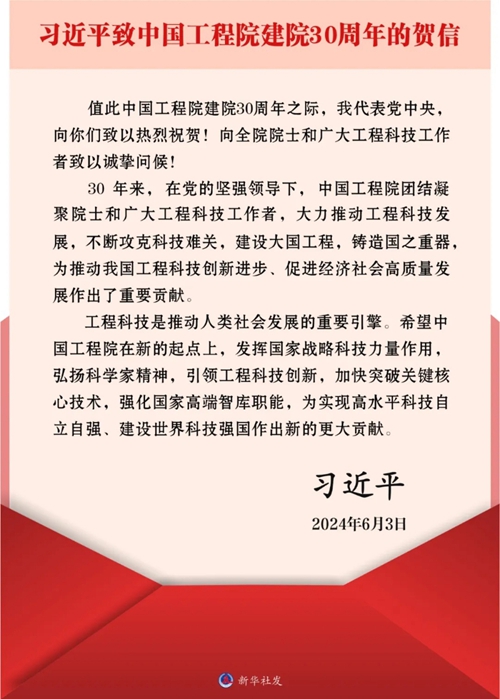 視頻來源:中央廣播電視總臺 習近平致信祝賀中國工程院建院30周年強調(diào) 發(fā)揮國家戰(zhàn)略科技力量作用 為實現(xiàn)高水平科技自立自強建設(shè)世界科技強國作出新的更大貢獻 丁薛祥出席院士座談會并講話 新華社北京6月3日電 在中國工程院建院30周年之際,中共中央總書記、國家主席、中央軍委主席習近平發(fā)來賀信,代表黨中央致以熱烈祝賀,向全院院士和廣大工程科技工作者致以誠摯問候。 習近平在賀信中指出,30年來,在黨的堅強領(lǐng)導(dǎo)下,中國工程院團結(jié)凝聚院士和廣大工程科技工作者,大力推動工程科技發(fā)展,不斷攻克科技難關(guān),建設(shè)大國工程,鑄造國之重器,為推動我國工程科技創(chuàng)新進步、促進經(jīng)濟社會高質(zhì)量發(fā)展作出了重要貢獻。 習近平強調(diào),工程科技是推動人類社會發(fā)展的重要引擎。希望中國工程院在新的起點上,發(fā)揮國家戰(zhàn)略科技力量作用,弘揚科學家精神,引領(lǐng)工程科技創(chuàng)新,加快突破關(guān)鍵核心技術(shù),強化國家高端智庫職能,為實現(xiàn)高水平科技自立自強、建設(shè)世界科技強國作出新的更大貢獻。 3日上午,中國工程院在京舉行“踐行工程科技使命 推進科技強國建設(shè)”院士座談會。中共中央政治局常委、國務(wù)院副總理丁薛祥出席會議,宣讀習近平賀信并講話。 丁薛祥在講話中指出,中國工程院成立30年來,堅決貫徹黨中央和國務(wù)院決策部署,大力推動工程科技發(fā)展,匯聚一流創(chuàng)新人才、產(chǎn)出一流科技成果、貢獻一流咨詢建議、打造一流學術(shù)平臺,在國家發(fā)展進步中發(fā)揮了重要作用。 丁薛祥強調(diào),在新時代新征程上,中國工程院要牢記建院初心、傳承光榮傳統(tǒng),在學習貫徹習近平總書記重要指示精神、為高水平科技自立自強而奮斗的進程中爭當排頭兵。要當國家戰(zhàn)略科技力量的排頭兵,牢牢把握新一輪科技革命和產(chǎn)業(yè)變革的戰(zhàn)略機遇,奮力搶占科技制高點。要當工程科技創(chuàng)新的排頭兵,解決好重大工程科技問題,推進科技創(chuàng)新成果產(chǎn)業(yè)化應(yīng)用,更好服務(wù)新質(zhì)生產(chǎn)力發(fā)展。要當突破關(guān)鍵核心技術(shù)的排頭兵,從國家急迫需要和長遠需求出發(fā),加強“卡脖子”技術(shù)攻關(guān),力爭在重要領(lǐng)域取得更多原創(chuàng)性突破。要當國家高端智庫建設(shè)的排頭兵,緊緊圍繞具有戰(zhàn)略性方向性全局性的重大問題,加強前瞻性、針對性、儲備性戰(zhàn)略研究,支撐黨和國家決策。丁薛祥希望廣大工程院院士帶頭大力弘揚科學家精神,把人生理想融入國家和民族的事業(yè)中,深懷愛國之心、秉持報國之志、勇攀科技高峰,不負黨和人民的殷切期望。 座談會上,中國工程院負責人和院士代表作了發(fā)言。 中國工程院成立于1994年6月3日。30年來,中國工程院牢記中國工程科技界最高學術(shù)機構(gòu)職責使命,聚力科技創(chuàng)新、匯聚領(lǐng)軍人才、建設(shè)高端智庫、堅持學術(shù)引領(lǐng),取得了一系列重大成果。 |