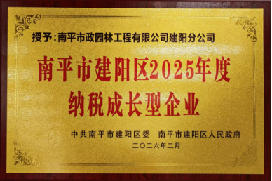 南平市政園林工程有限公司: 建陽區(qū)2025年度納稅成長型企業(yè) 市政園林公司深耕市政園林領(lǐng)域,憑借卓越的工程品質(zhì)和良好的市場信譽,業(yè)務發(fā)展迅速,企業(yè)效益與納稅貢獻同步實現(xiàn)顯著增長。